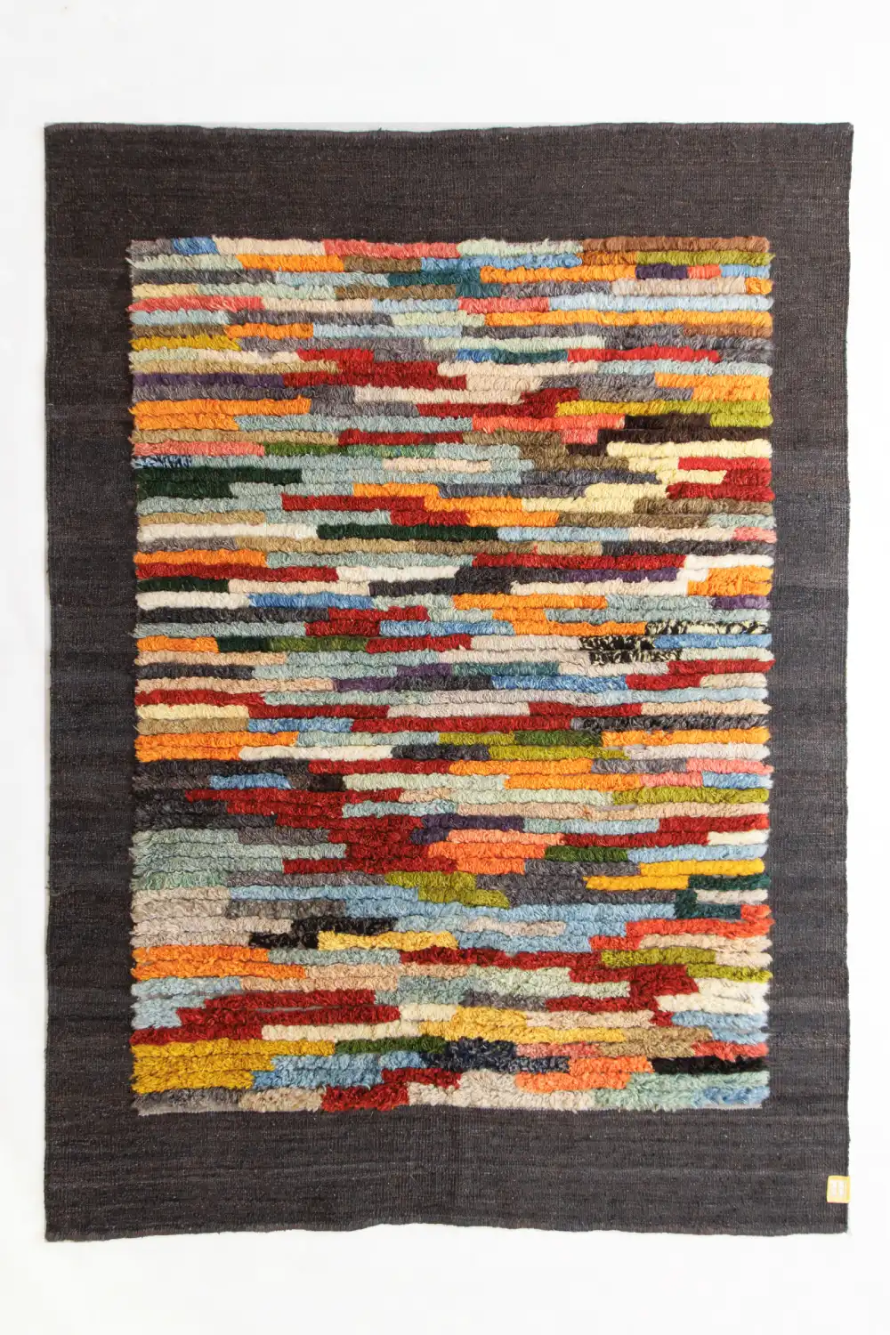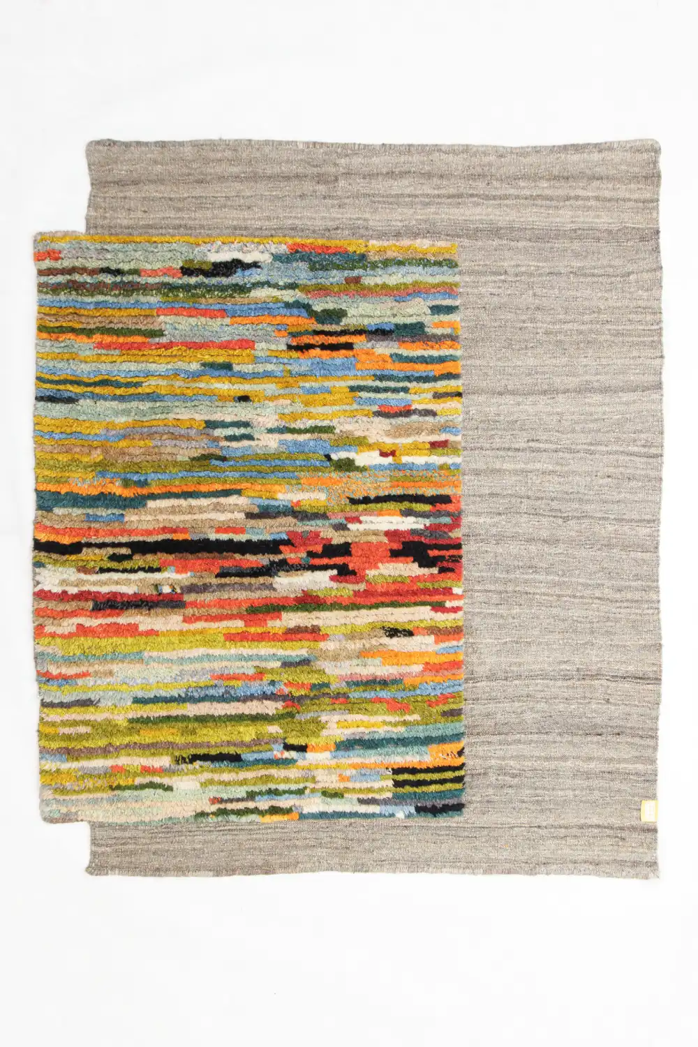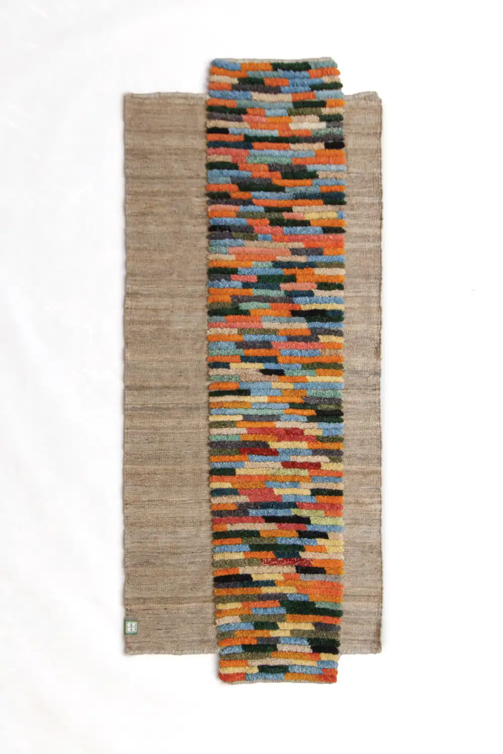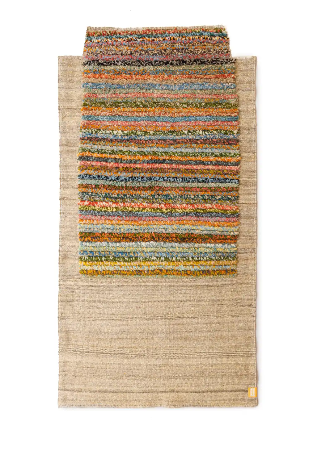 این مجموعه آمیزهایست از گبه و گلیم، از نظم و بینظمی، از بافت و خلا. هیچ دو قطعهای در این مجموعه شبیه هم نیستند، چرا که هرکدام حاصل یک تصمیم آنی و منحصربهفرد از ذهن خلاق بافندهاند.