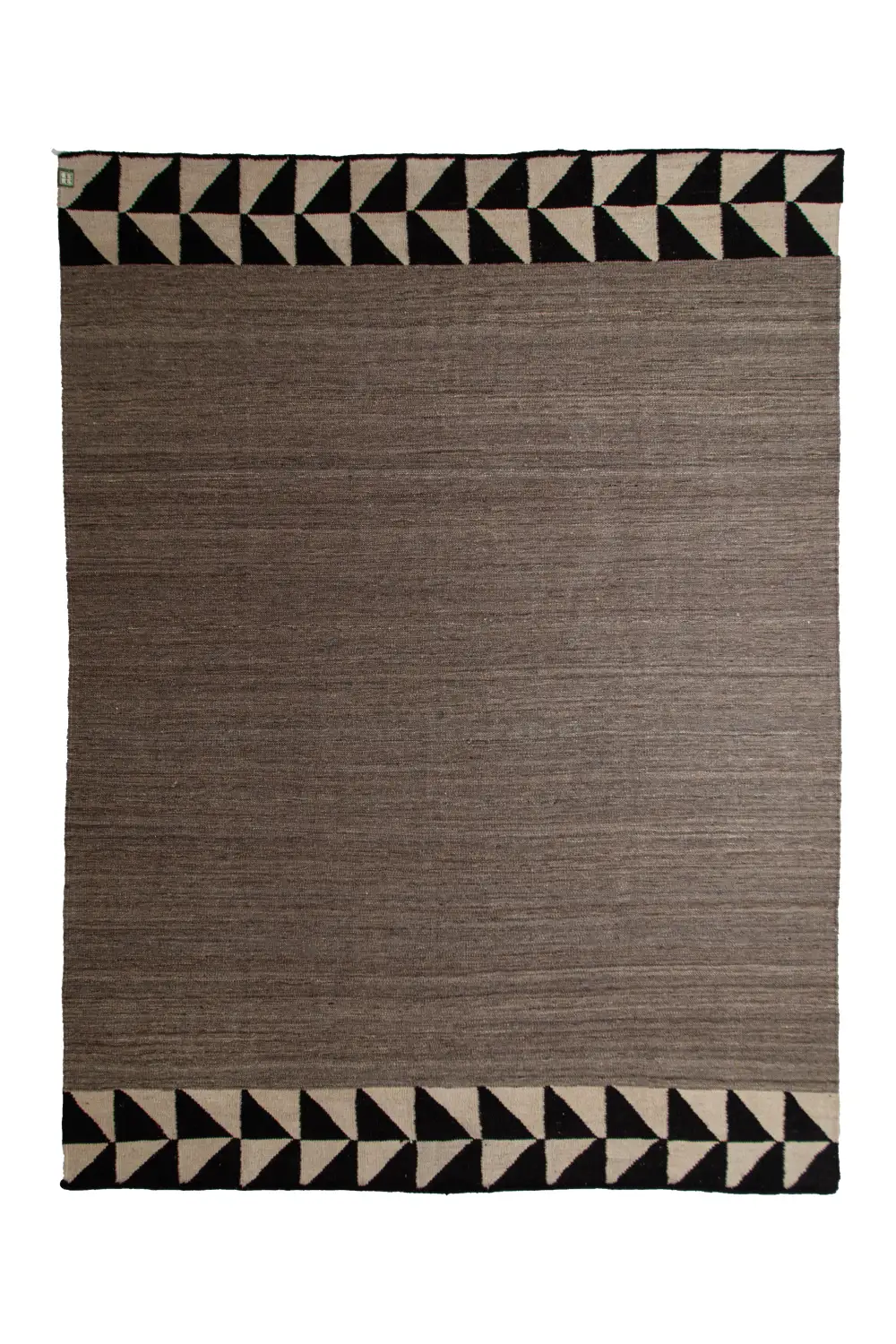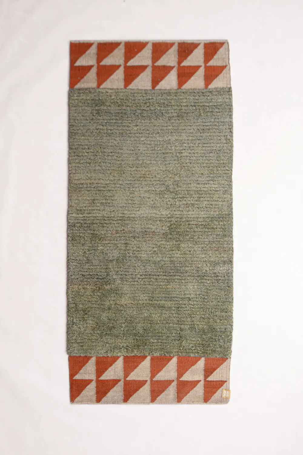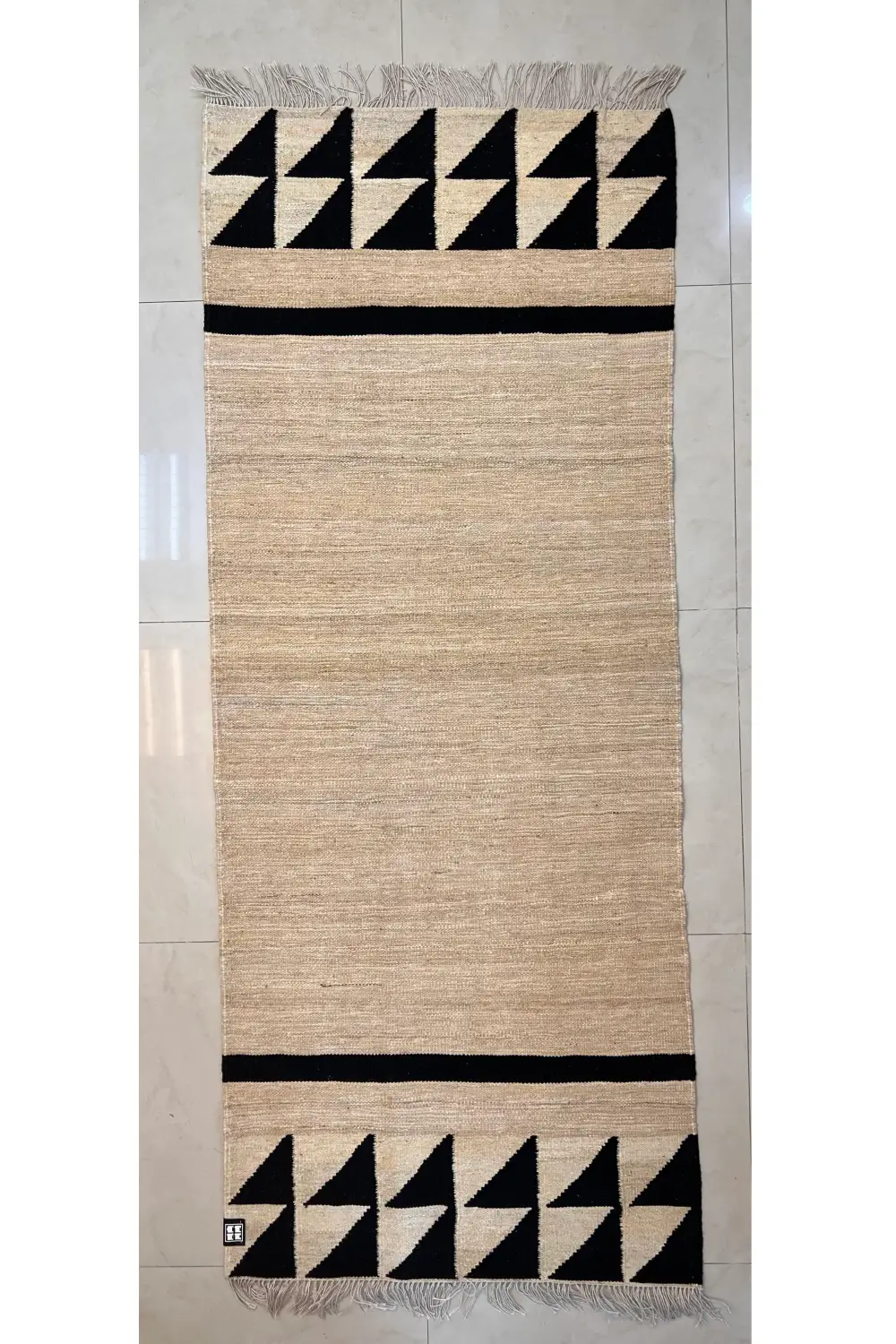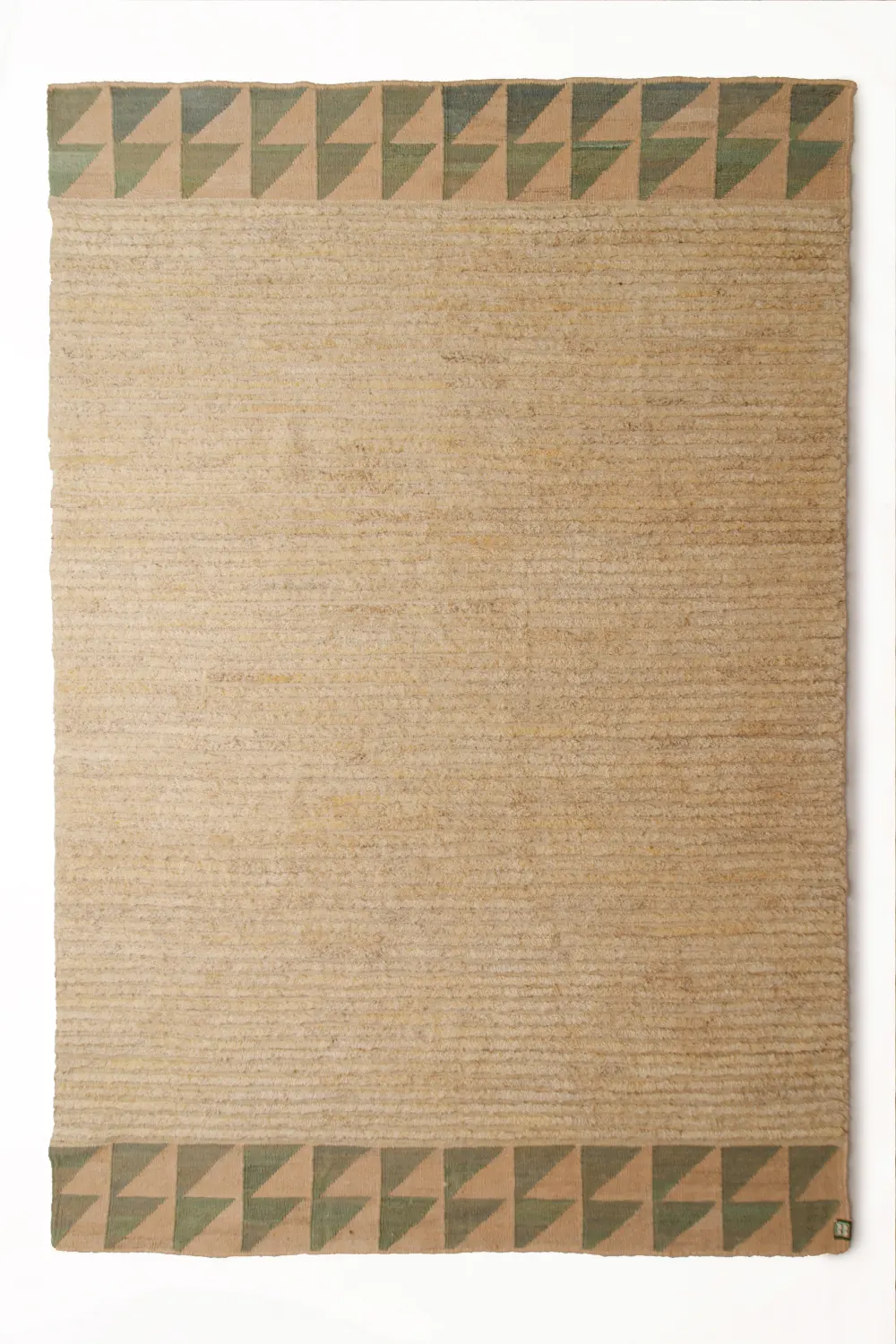 در مجموعهی «Sora »، مرز میان گبه و گلیم به لطیفترین شکل ممکن محو میشود. زمینهی اصلی هر قطعه از بافت گبه شکل گرفته؛ بافتی نرم، پرحجم و صمیمی که حس گرما و امنیت را به فضا منتقل میکند. در بالا و پایین هر فرش، نوارهایی با اشکال هندسی شکسته به سبک گلیم دیده میشود—با رنگهایی خالص و جسور که به اثر ریتم و شخصیت میبخشند.